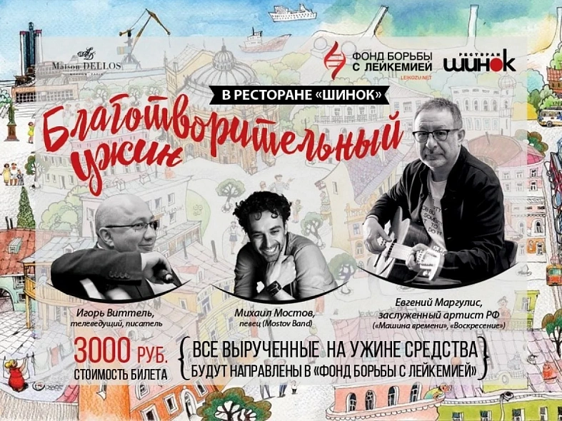 Одесский вечер в ресторане «Шинок» состоится 12 июля, вырученные средства пойдут в «Фонд борьбы с лейкемией». Ведущие вечера, — Игорь Виттель, российский журналист, продюсер, и телеведущая Надана Фридрихсон, создадут для гостей непринужденную атмосферу общения, привнеся в приятную беседу одесский колорит. Гости вспомнят ставшие легендой одесские анекдоты и истории, полные доброй ностальгии.